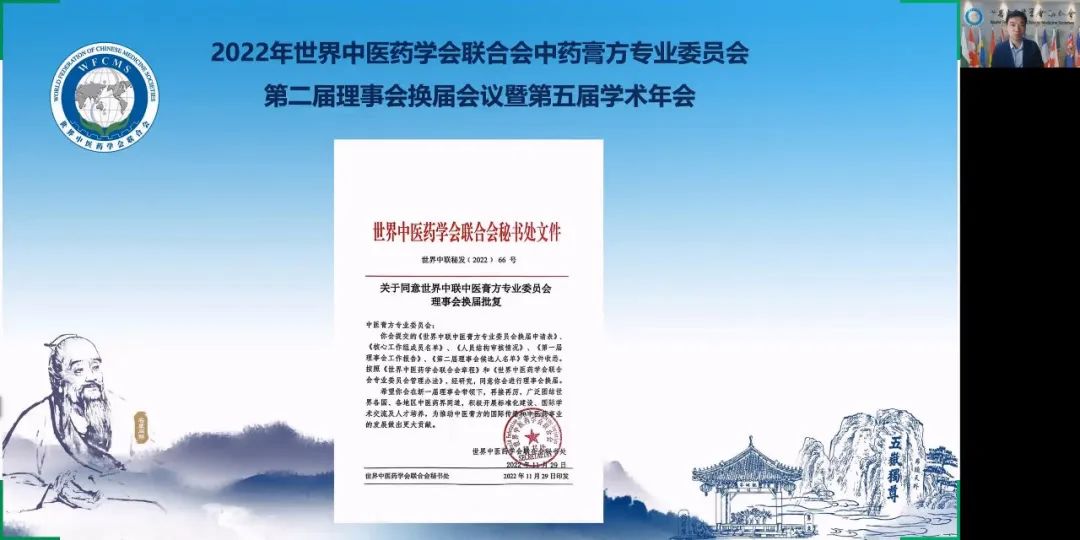 2022年12月4日上午,世界中醫(yī)藥學(xué)會(huì)聯(lián)合會(huì)(世界中聯(lián))中醫(yī)膏方專業(yè)委員會(huì)第二屆理事會(huì)換屆會(huì)議暨第五屆學(xué)術(shù)年會(huì)通過線上方式隆重召開。世界中聯(lián)主席馬建中向大會(huì)發(fā)來(lái)視頻致辭,學(xué)術(shù)部主任焦云洞代表世界中聯(lián)參加大會(huì),全國(guó)政協(xié)委員、首都名中醫(yī)、享受國(guó)務(wù)院政府特殊津貼專家、世界中聯(lián)中醫(yī)膏方專業(yè)委員會(huì)會(huì)長(zhǎng)、北京康益德中西醫(yī)結(jié)合肺科醫(yī)院董事長(zhǎng)兼院長(zhǎng)董瑞和顧問、副會(huì)長(zhǎng)、常務(wù)理事、理事及會(huì)員共335人參加了大會(huì)。其中來(lái)自匈牙利、葡萄牙、澳大利亞、俄羅斯、瑞典、波蘭、英國(guó)、美國(guó)、芬蘭、韓國(guó)、中國(guó)香港、中國(guó)澳門、中國(guó)臺(tái)灣等地的外籍專家學(xué)者65人。會(huì)議由第一屆理事會(huì)秘書長(zhǎng)秦洪義教授主持。