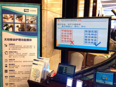 展會(huì)期間我公司接待了觀展及參展人員數(shù)百人,眾多人員關(guān)切詢問我公司產(chǎn)品,本次展會(huì)我公司展出了天坦移動(dòng)護(hù)理系統(tǒng),天坦移動(dòng)查房系統(tǒng),及醫(yī)療大數(shù)據(jù)分析平臺(tái),通過現(xiàn)場演示受到了眾多專業(yè)人士和媒體的高度關(guān)注,尤其是天坦移動(dòng)護(hù)理系統(tǒng)吸引了眾多觀眾的眼球。