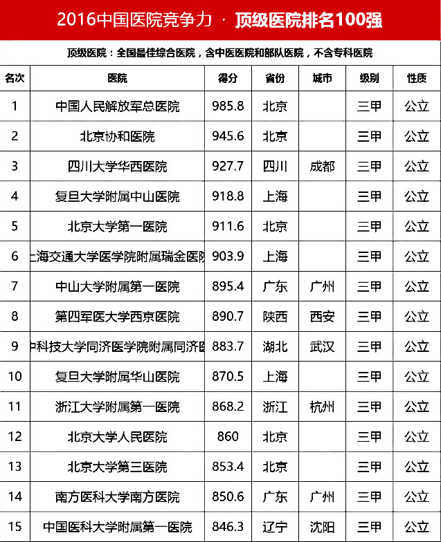 “頂級醫(yī)院100強”采用的排名指標體系包括四個方面:醫(yī)院最優(yōu)規(guī)模(實開床位數(shù)、年門急診量、年出院量、全院人數(shù));醫(yī)療技術(shù)(正高職稱人數(shù)/全院人數(shù)、全院醫(yī)師人數(shù)/實開床位數(shù)、醫(yī)療設(shè)備資產(chǎn)/總資產(chǎn)、年住院手術(shù)量/年出院量、國家級衛(wèi)紀委臨床重點???總??茣?、ICU床占比);醫(yī)院運行(平均住院天數(shù)、床位使用率、門診均次費用/當(dāng)?shù)厝司鵊DP、住院均次費用/當(dāng)?shù)厝司鵊DP、外省住院病人占比);學(xué)術(shù)影響力(院士人數(shù)、學(xué)術(shù)領(lǐng)袖占比、教育部重點學(xué)科及重點實驗室/總??茢?shù)、本年度獲國家自然科學(xué)基金項目數(shù)量和總?cè)~)。